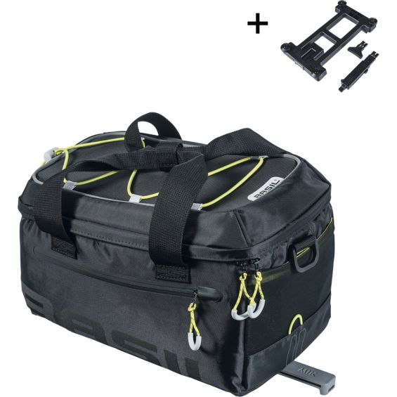 De Basil Miles bagagedragertas MIK is de perfecte keuze voor sportieve fietsers en avonturiers. Of je nu op fietsvakantie gaat of een dagtocht maakt, deze multifunctionele en waterdichte tas is een onmisbare metgezel. Extra veiligheid en gebruiksgemak Naast dat je de tas makkelijk bevestiging op je bagagedrager neem je de tas comfortabel mee over je schouder, met een afneembare schouderband, handige handgrepen en een inhoud van in totaal 7 liter, verdeeld over diverse binnenvakken. Hij heeft een stevige binnenvoering, wat ten goede komt aan de kwaliteit van de tas. Je sluit deze sportieve bagagedragertas af door middel van een roltopsluiting tevens bevindt zich aan de tas een lusje voor (led)verlichting. Maak je graag een recreatieve fietstocht in je vrije tijd of ga je telkens met je fiets naar de sportschool? Dan is de Basil Miles een onmisbaar accessoire. Het is een veelzijdige en opvallende tas, en daardoor een aankoop waar je geen spijt van zal krijgen. Eenvoudige MIK-bevestiging Je bevestigt de tas eenvoudig dankzij de voor gemonteerde MIK-adapterplaat. Met deze adapterplaat klik je de fietstas eenvoudig in jouw bagagedrager met MIK-profielen of een MIK-bagagedragerplaat. Wil je de tas meenemen de natuur in? Dan klik je de mand er net zo gemakkelijk weer af. De MIK-adapterplaat past op veel bagagedragers, dames-, heren-, en de elektrische fiets. Eigenschappen: Extra reflecterende details en bevestiging voor Ledverlichting voor optimale zichtbaarheid in het donker. Snel en stevig te bevestigen dankzij de MIK-adapterplaat (inclusief). Geschikt voor: Elektrische fietsen, stadsfietsen en trekkingfietsen Volledig waterdicht, met getapete naden en een roltopsluiting. Comfortabel te dragen - Gebruik de afneembare schouderband of handgrepen voor extra draaggemak. Specificaties: Afmetingen: 29 x 18 x 17 cm (Buitenmaten) Volume: 7 - 8 liter Sluiting hoofdvak: Roltopsluiting Extra vak: Bidon Positie op de fiets: Achterop Bevestiging op: Bagagedrager Dubbel of enkel: Enkel Materiaal: Polyester Waterbestendig: Waterdicht Draagcapaciteit: Max. 5 kg Kleur: Zwart Met de Basil Miles MIK bagagedragertas ben je altijd voorbereid op je volgende fietsavontuur!