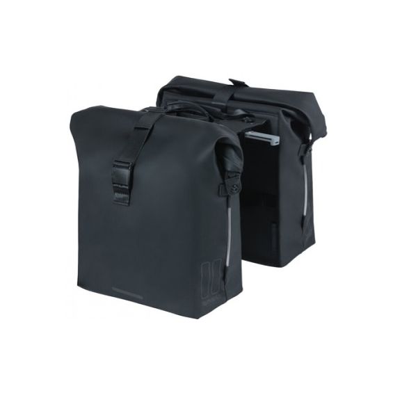 Ben je op zoek naar een ruime fietstas die er ook nog eens mooi uitziet? Dan is de Basil SoHo dubbele fietstas Nordlicht MIK in de zwarte kleur echt iets voor jou. Gemaakt van mat PU-materiaal dat erg zacht aanvoelt* met een inhoud van 41 liter. De tas is waterdicht (IPX3), waardoor jij jouw spullen altijd droog meeneemt. De tas sluit je af met een roltop die je aan de zijkanten van de tas met drukknopen bevestigt.