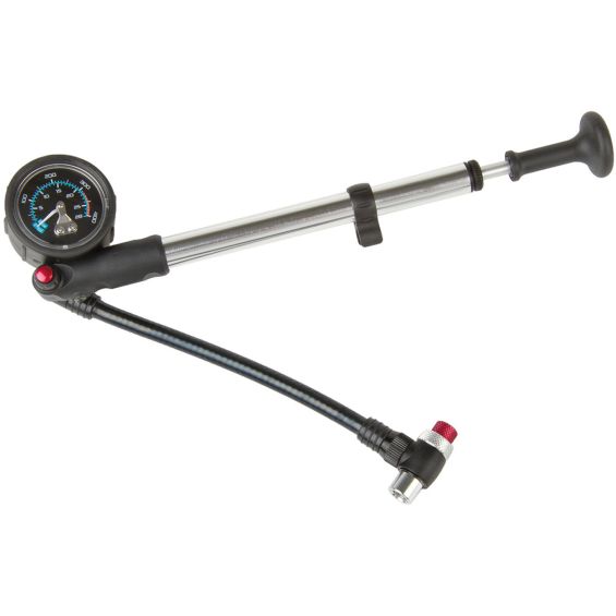 aluminium pomp met plastic handvat zowel bruikbaar als schokpomp en minipomp omschakelbaar van hoog volume naar hoge druk aluminium pompkop en een opvouwbare slang met geïntegreerde manometer en drukontlastingsknop tot 21 Bar / 300 psi met beugel of FV, AV en DV op Beto eurohole-kaart
