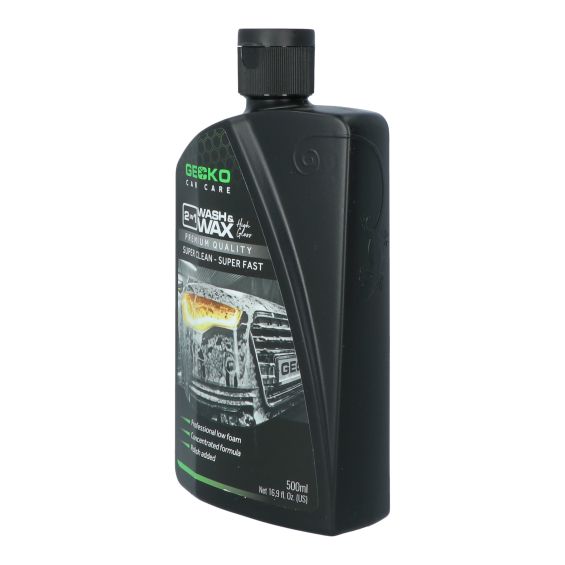 Gecko 2in1 Wash & Wax is een professionele autoshampoo die de lak voedt en reinigt. De speciaal toegevoegde Carnauba draagt ertoe bij dat, tussen de normale wasbeurten door, het water makkelijk van de lak afloopt. Het verhoogt de bescherming, verkort de droogtijd en laat een schitterende glans achter. Met de ontwikkeling van de Gecko autoshampoo zijn alleen de allerbeste ingrediënten gebruikt, waardoor dit middel de allerhoogste reinigingseigenschappen bevat en slechts een paar kleine dopjes voldoende zijn om de auto volledig te reinigen en een superglans te geven. De Gecko 2in1 Wash & Wax is een autoshampoo die te gebruiken is in combinatie met alle Gecko poets producten.