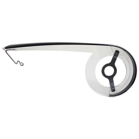 Hesling kettingscherm "Cambio" in presentatieverpakking. Wordt gebruikt op o.a. Koga / Batavus / Sparta. Eigenschappen: 1-vleugelig Kunststof Incl. toebehoren Voor crankbladen tot 48 tanden Ø 22 cm Transparant met zwarte afdekrand