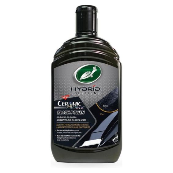 Turtle Wax Hybrid Solutions Ceramic Acrylic Black Polish is een alles-in-een formule die corrigeert, verbetert en bescherming toevoegt aan zwarte lakafwerkingen. Precisie polijstplaatjes verwijderen krassen, swirls en andere lakimperfecties. Zwart gepigmenteerd polijstmiddel en Carnauba wax vullen lichte imperfecties op en laten een diepe, rijke zwarte glans achter. De keramische SiO2 & Acryl Polymeren produceren een duurzame beschermlaag die water en agressieve chemicaliën afstoot en permanente watervlekken maandenlang helpt voorkomen.