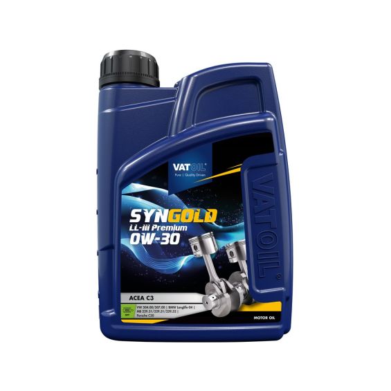 Vatoil SynGold LL-III Premium 0W-30 is een vol-synthetische Mid-SAPS motorolie. Deze Long Life motorolie is o.a. speciaal ontwikkeld voor personen- en bestelwagens van de VAG-groep, Mercedes en BMW. SynGold LL-III Premium 0W-30 is geschikt voor benzine- en dieselmotoren. Tevens geschikt voor verlengde verversingsintervallen en auto's met een dieselroetfilter. Raadpleeg altijd de adviesdatabase op www.vatoil.com en/of de smeerinstructies van de voertuigfabrikant.
