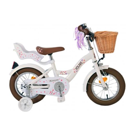 Voor ieder kind is leren fietsen een feestje met de Volare Blossom 12 inch kinderfiets! Veiligheid staat voorop! Daarom heeft deze gave fiets een handrem en terugtraprem, afneembare zijwieltjes en een gesloten kettingkast. De fiets heeft reflectoren van voor, achter en in de wielen. Ook aan het comfort is gedacht. De mooie witte Volare fiets heeft een comfortabel zacht zadel, een poppenzitje, een handig rieten mandje en vrolijke handvatstreamers op de fiets op te fleuren Om zo lang mogelijk van de fiets te kunnen genieten zijn het zadel en stuur in hoogte verstelbaar. Wordt geleverd inclusief al het montagemateriaal dat nodig is om de fiets in elkaar te zetten!